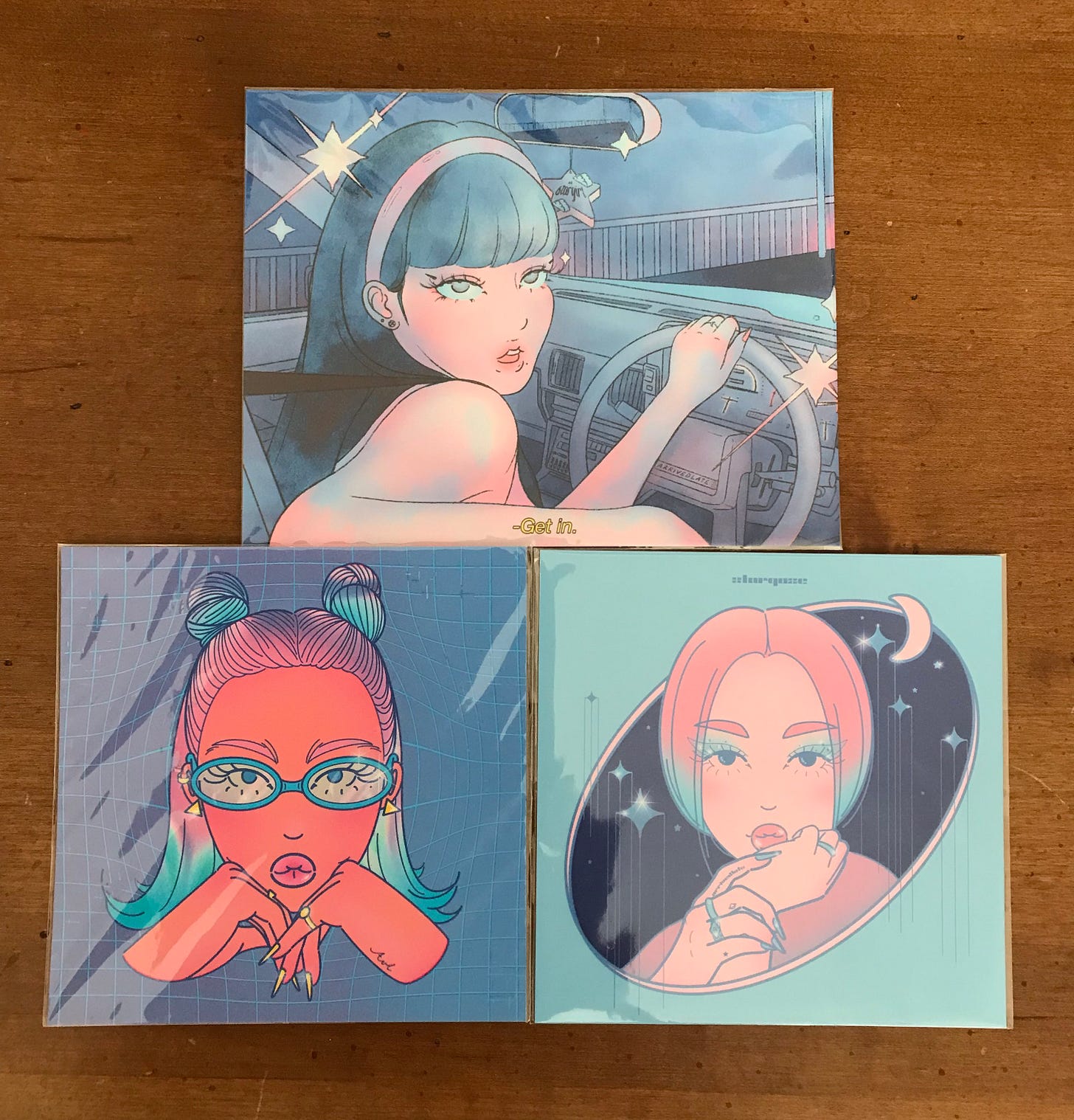 It felt as if I had entered an 80s dream: a retro vending machine holding small prints, a brick cellphone, a record player, and a media player playing fuzzy clips of old anime movies. After introducing ourselves, I asked her about her journey as an artist and the inspiration behind her pieces. A Design graduate from OCAD University, she explained that her artworks are rooted in nostalgia, and are heavily inspired by Vaporwave and the pastel pop aesthetic of the 80s. As an aspiring artist, learning more about where an established artist draws their inspiration from was important, as it allows me to find inspiration in areas I haven’t yet explored.