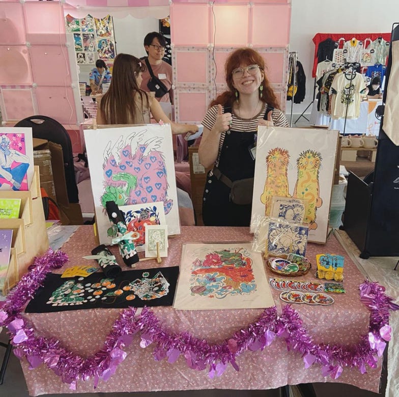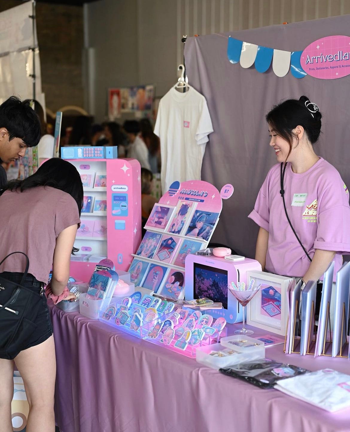 It was finally my turn to enter the venue. Before me was a sea of carefully curated art booths buzzing with city goers. I observed the organization of the tables; there was no apparent grouping by art style. Ceramic artists were seated next to comic book artists and jewellery makers were seated next to digital artists. True to the market’s mission and values, this arrangement did not put anyone into boxes—they encouraged artists of different stylistic backgrounds to connect. Close to the entrance, my eyes darted towards a dreamy, pastel-coloured table, and I met my first artist of the day.